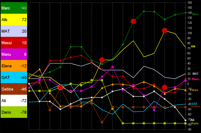 Che dire degli altri giocatori quali Stefano Ali, Sebba e Dario? Beh, sappiamo che possono fare di più… ma al gioco della Peppa la costante è sempre Zero… se c’è qualcuno che fa 140 punti positivi… ci dovrà necessariamente essere chi si prende carico in negativo, almeno in parte, di quei 140 punti.