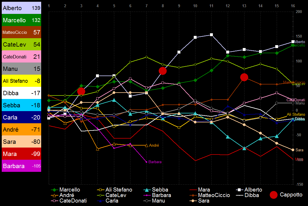 Alla fine i giocatori sono stati 14, cosicché abbiamo adottato la formula dell’eliminazione degli ultimi 2 in classifica, dopo che tutti erano usciti per un turno.