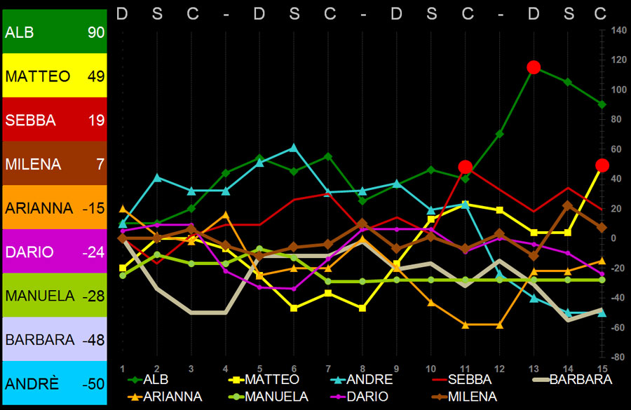Ma Marcello riprende subito la vetta e la tiene fino al 13mo giro. Qui Alberto fa una mano sorprendente, complice un Dibba sfortunato ed incartato che prende tutti i punti negativi che sembravano destinati ad Alberto, -48 per il Dibba che fin qui aveva fatto una splendida partita e +36 per Alberto che va a 110. Gattoni 85; Marcello 81 punti.