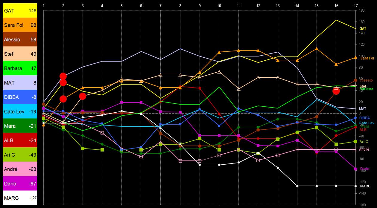 Alla 14esima mano Gattoni ha 99 pti; Sara 93 pti Matteo 80 pti…. la peppa è in agguato….