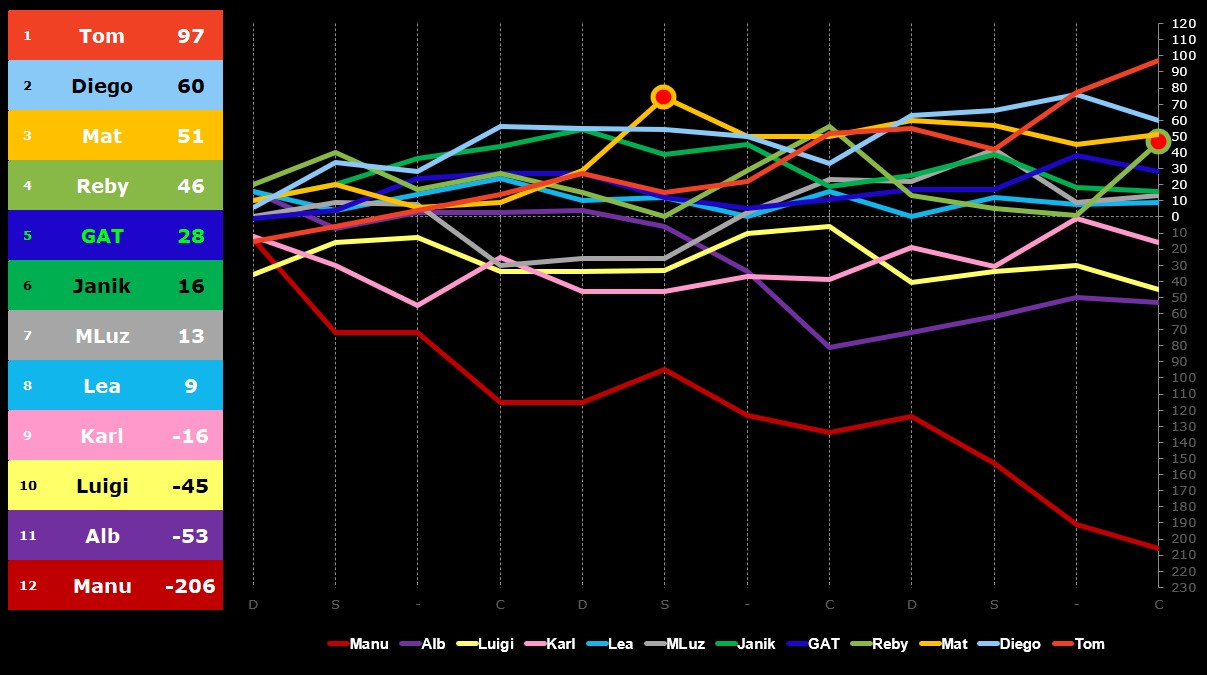 Tommaso ha svolto la partita perfetta, nel suo cammino è inciampato solo 3 volte, solamente in 3 mani ha preso punti negativi, e neppure troppi, le altre 9 mani ha portato a casa un piccolo bottino, senza strafare, poi nelle ultime 2 mani ha sferrato la zampata e confezionato 55 punti che lo hanno portato al trofeo con 97 punti. Complimenti!